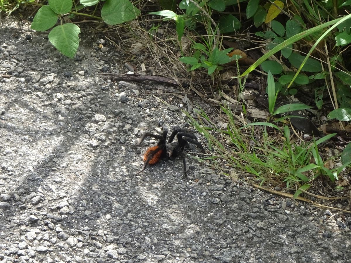 Sur le chemin perpendiculaire à la grand-route qui mène au village, on aperçoit un autre mygale traversant devant nous...
