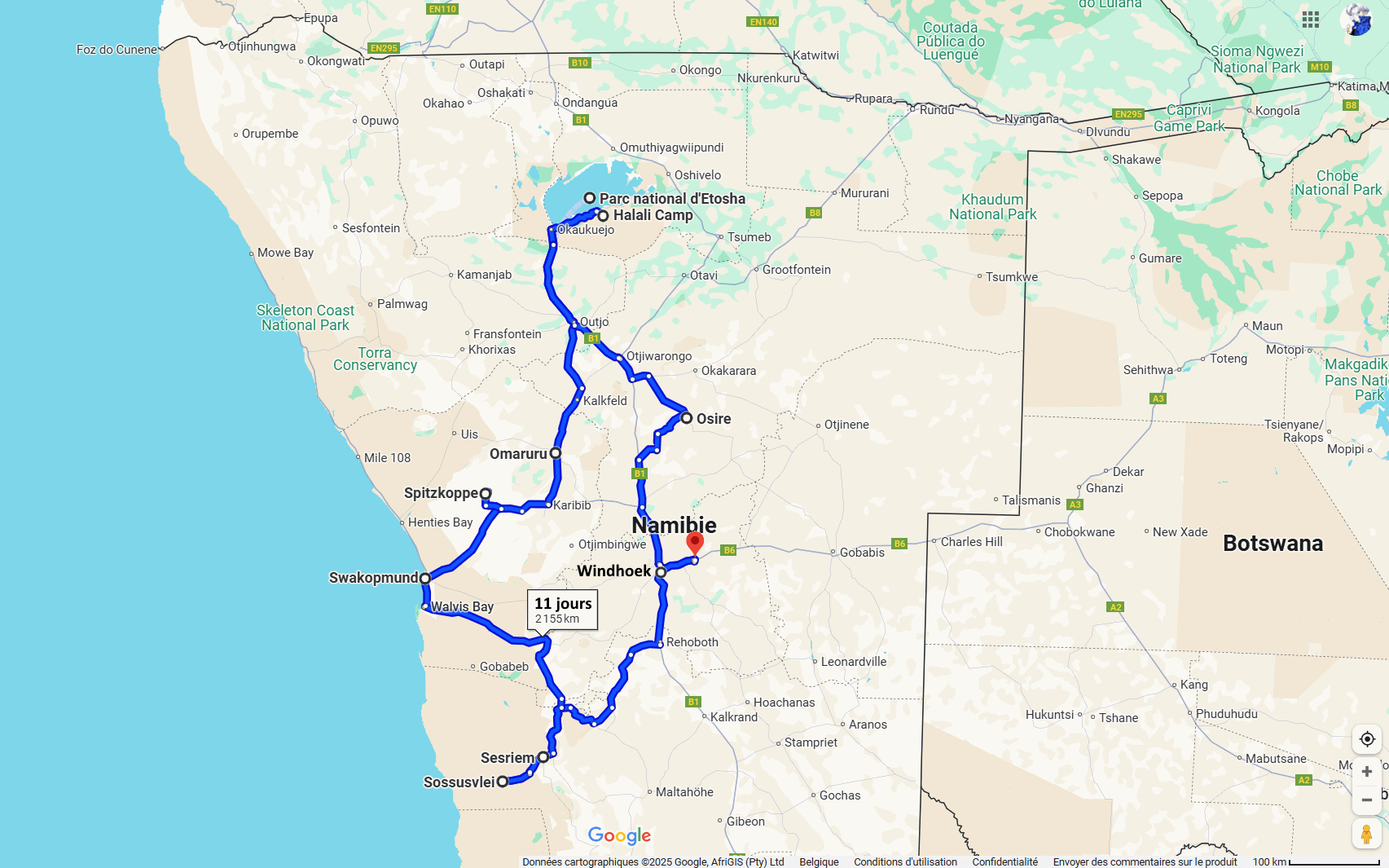 Après avoir tout chargé, on quitte le Oshana Camp peu après 10h30.